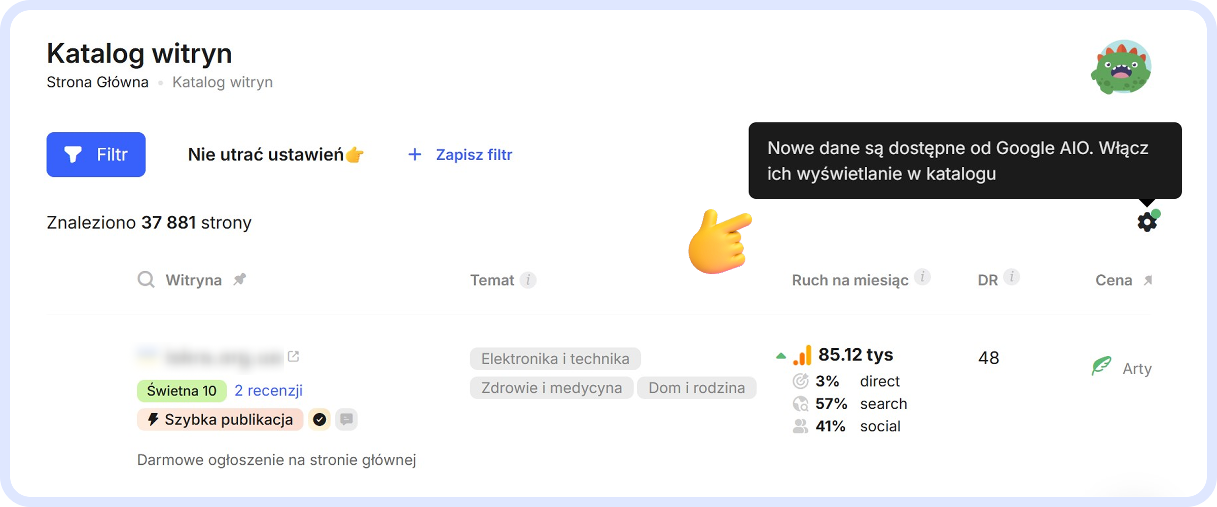 Teraz w tabeli katalogu od razu zobaczysz liczbę słów kluczowych, dla których dana strona pojawia się w Google AI Overviews💪
