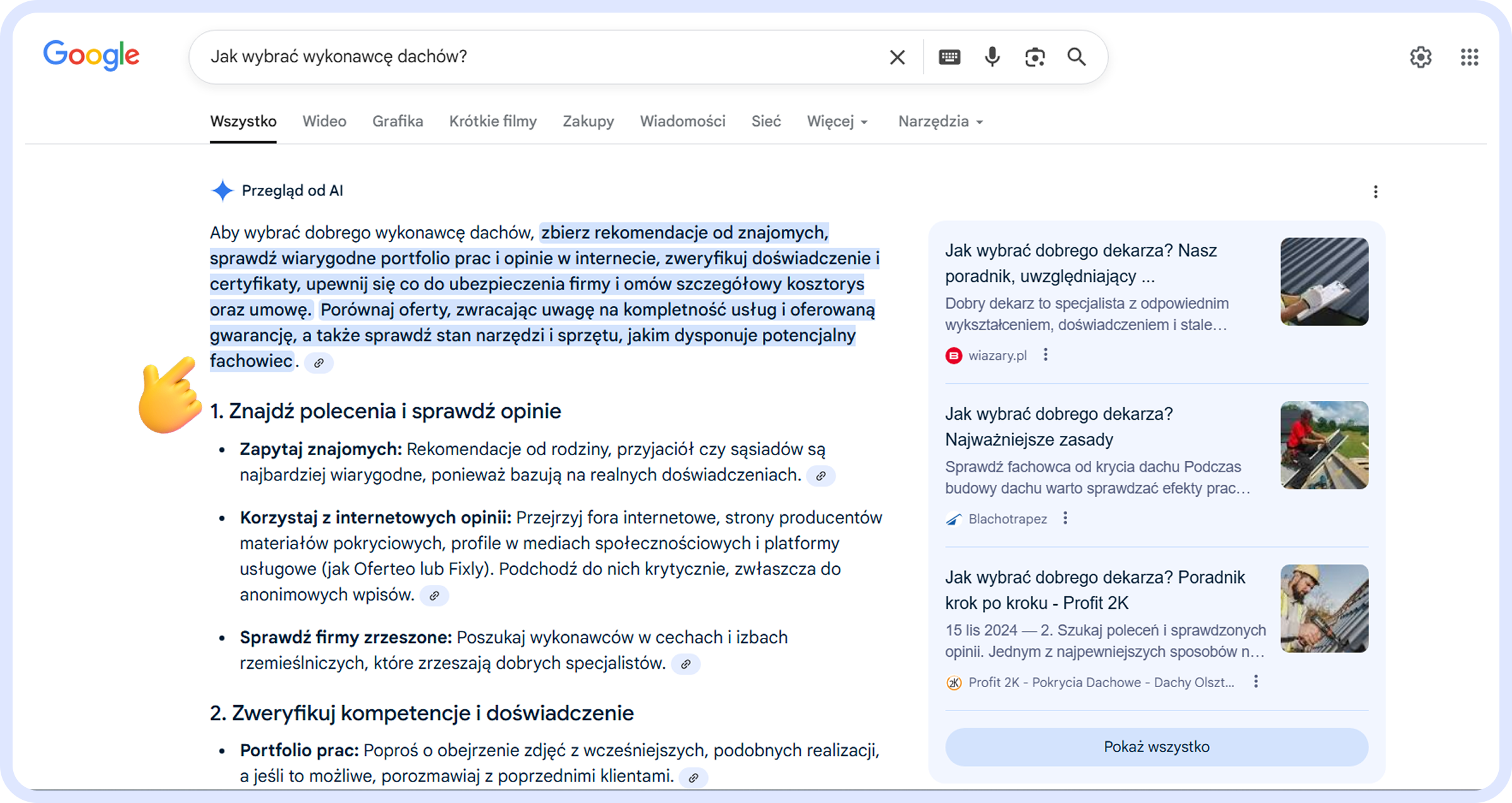 Aby szybko i wygodnie wybierać strony, włącz filtrowanie według Google AI Overviews.